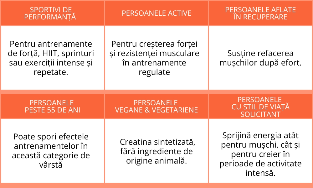Creatina ajută mușchii să producă energie rapid în timpul exercițiilor intense, ceea ce poate îmbunătăți performanța în eforturi scurte și repetate.