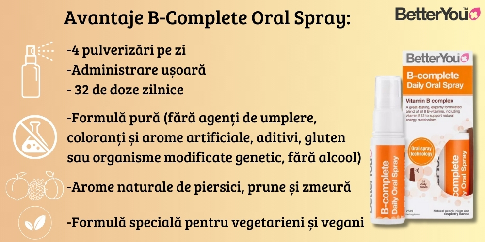 Spray-ul oral B-Complete de la BetterYou reprezintă o modalitate plăcută și eficientă pentru menținerea sănătății generale a organismului, îmbunătățind nivelul de energie, funcționarea sistemului nervos și sănătatea pielii.