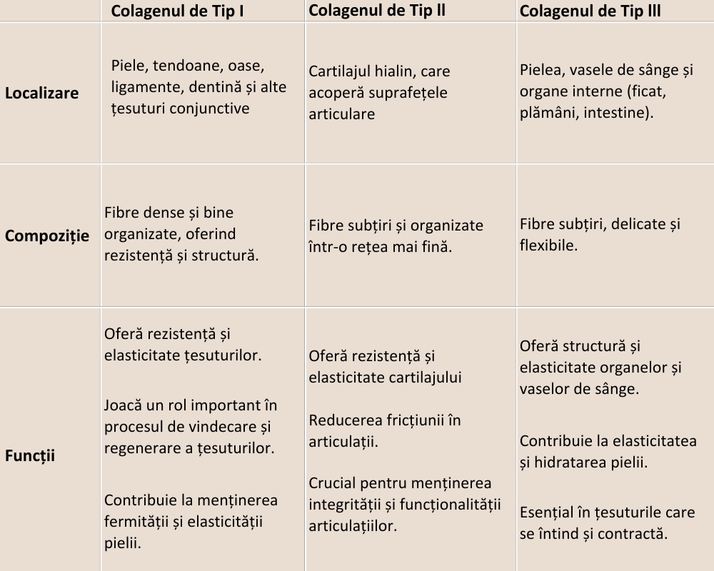 - Tip II: Elasticitate și suport în cartilajul articular; important pentru sănătatea articulațiilor.
