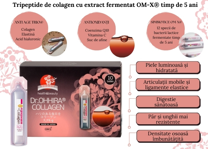 Colagenul de la Dr. Ohhira are o compoziție unică și eficientă, realizată din tripeptide de colagen, elastină, acid hialuronic, coenzima Q10, vitamina C, Royal Jelly și complex vegetal fermentat timp de 5 ani OM-X®.