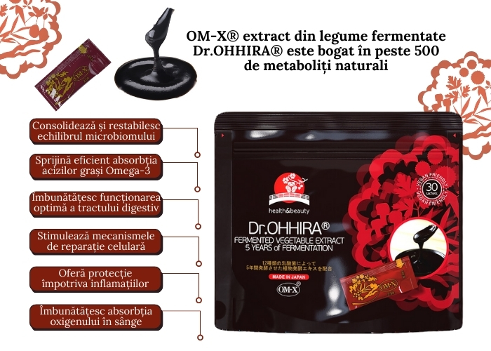 Extractul de legume fermentate timp de 5 ani de la Dr.Ohhira este un produs unic pe piață, o combinație de probiotice, prebiotice și postbiotice care încep să acționeze imediat și să își facă efectul chiar în cavitatea bucală. Această pastă OM-X® permite organismului să absoarbă mult mai bine nutrienții, vitaminele și mineralele.