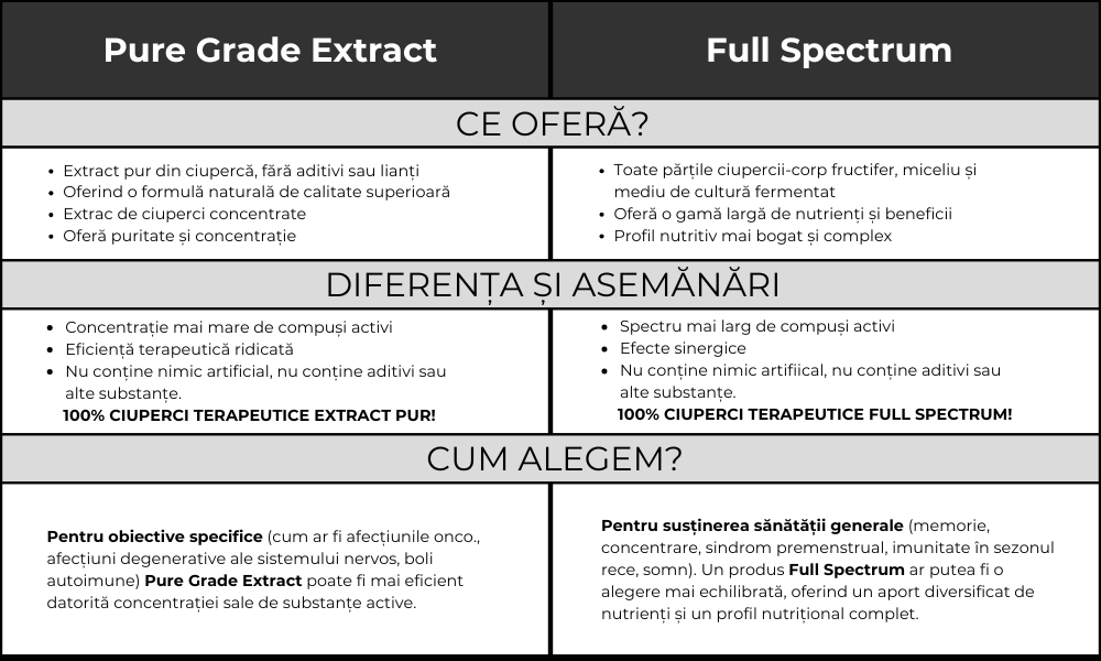 - Spectru complet de nutrienți: Full Spectrum combină diversele componente ale ciupercii, oferind o cantitate mai echilibrată de substanțe active.