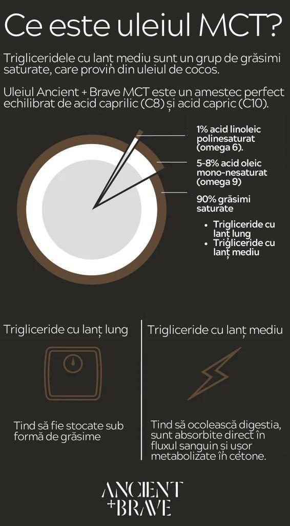Uleiul MCT este o sursă foarte concentrată de trigliceride cu lanț mediu, cu o formulă mai bună decât cea a uleiul de cocos. În timp ce uleiul de cocos conține patru tipuri de trigliceride cu lanț mediu, uleiul MCT conține doar C8 și C10, care sunt cele două trigliceride cu lanț mediu care ocolesc digestia, sunt absorbite cu ușurință direct în fluxul sanguin, mai apoi în ficat, ca în final să fie transformate în cetone pentru energie.