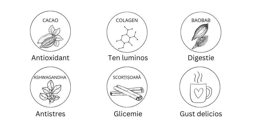 Cacao organică crudă (30%), cacao organică, peptide de colagen hidrolizat din sursă bovină – provenit de la bovine hrănite cu iarbă (20%), sfeclă roșie organică, scorțișoară organică, roșcove organice, ashwagandha organică, baobab organic, sare roz de himalaya.