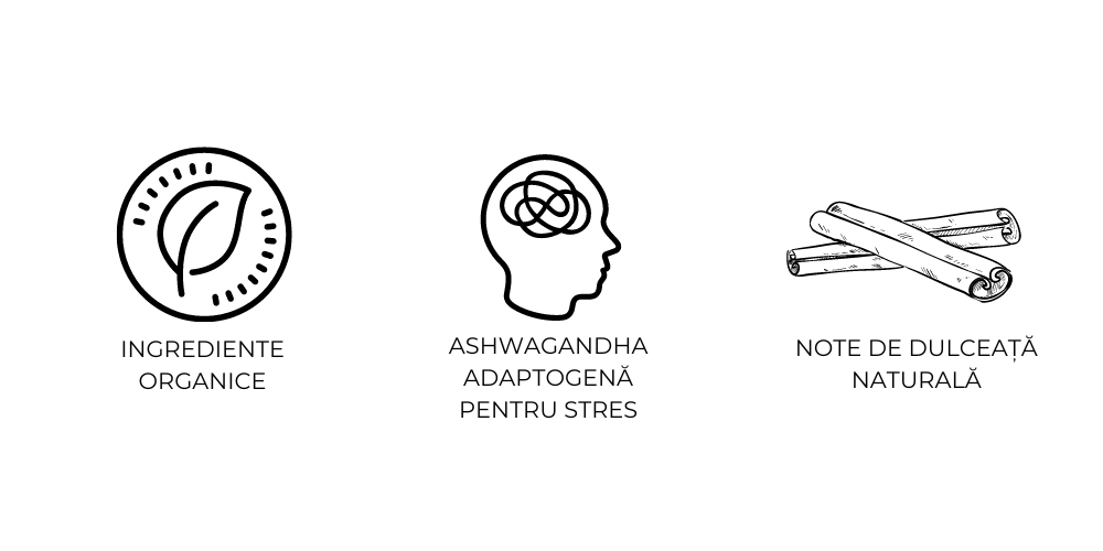 - Ashwagandha organică cunoscută pentru beneficiile directe asupra stării de spirit și rezistenței la stres.