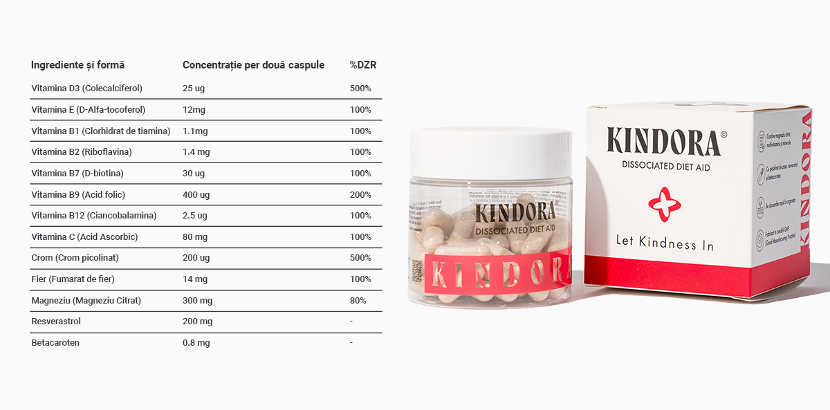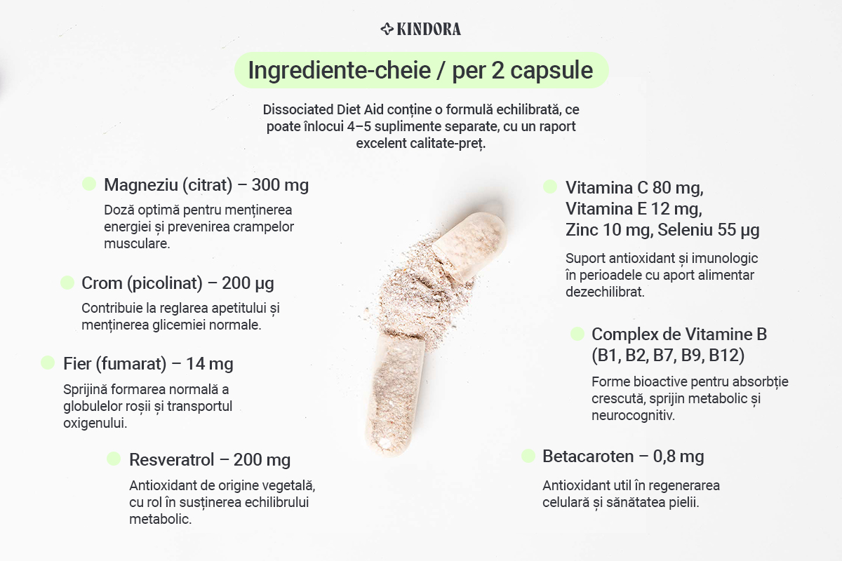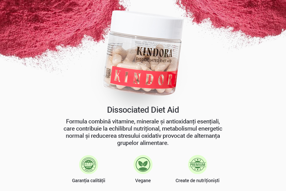 Dissociated Diet Aid este un supliment alimentar creat de nutriționiștii Kindora, destinat să susțină organismul în perioadele în care urmezi o dietă disociată. Formula combină vitamine, minerale și antioxidanți esențiali, care contribuie la echilibrul nutrițional, metabolismul energetic normal și contribuie la protejarea celulelor împotriva stresului oxidativ provocat de alternanța grupelor alimentare.