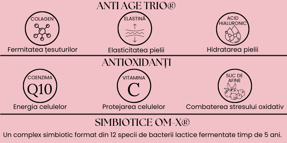 Dr.Ohhira® Anti Age Colagen cu OM-X® nu este doar un alt colagen, ci formula inovatoare elaborată de faimosul microbiolog japonez Dr. Iichiroh Ohhira ce combină un complex super eficient de tripeptide de colagen, elastină, acid hialuronic, coenzima Q10, Vitamina C, Royal Jelly și complexul vegetal fermentat timp de 5 ani, OM-X®.