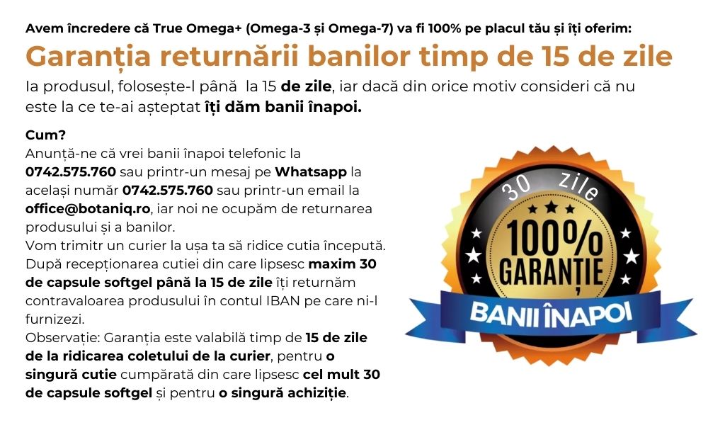 True Omegas+ oferă doze optime de omega-3 și omega-7, fiind o sursă concentrată de nutrienți care poate ajuta la completarea unei diete echilibrate.