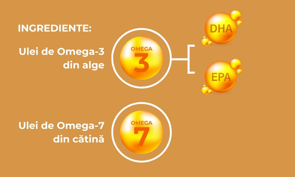 FORMULĂ INOVATOARE CARE CONȚINE OMEGA-3 ( ACIZI GRAȘI ESENȚIALI: DHA-300mg ȘI EPA-150mg) ȘI OMEGA-7 EXTRASĂ DIN CĂTINĂ.