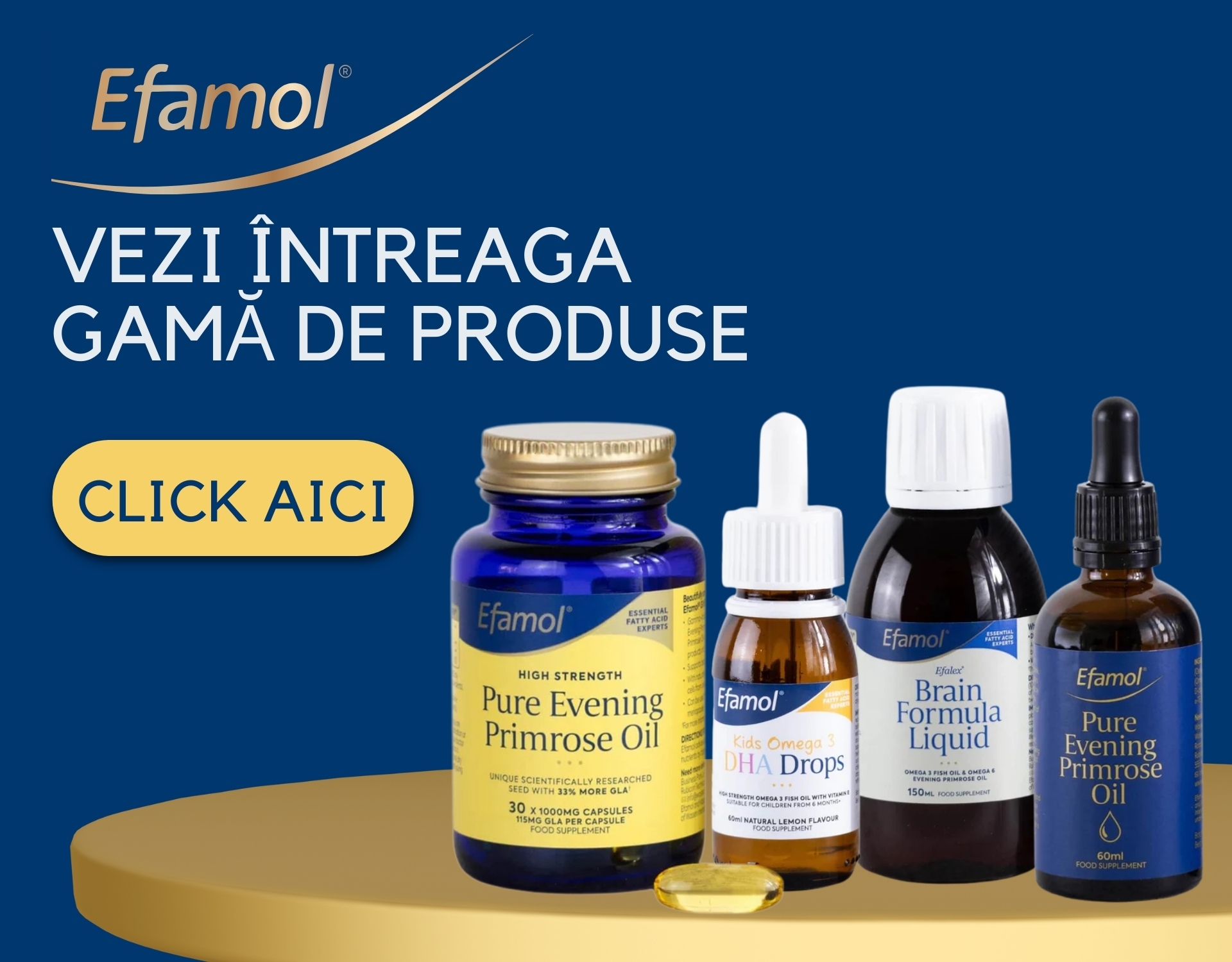 Pure Evening Primrose 904 mg picături (60 ml), Efamol® este un supliment alimentar creat științific, care susține starea de bine a femeilor în perioade de schimbări hormonale, sănătatea pielii și țesutului conjunctiv dar și echilibrul general al organismului, datorită conținutului său natural de GLA (acid gamma-linolenic) și vitamina E, cu rol antioxidant.