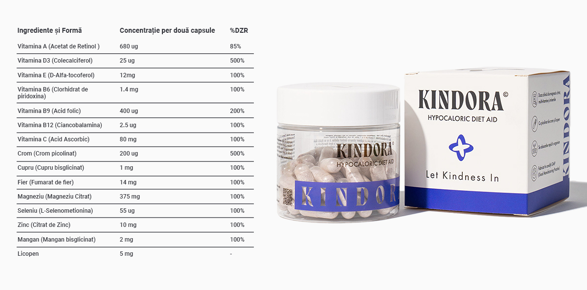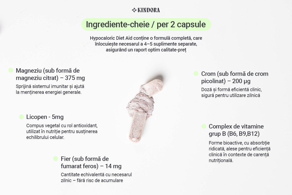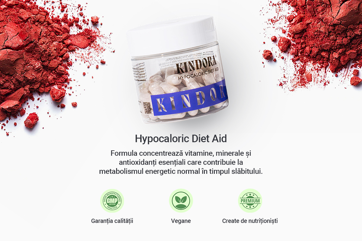 Hypocaloric Diet Aid este un supliment alimentar creat de nutriționiștii Kindora, destinat să susțină organismul în perioadele de deficit caloric. Formula concentrează vitamine, minerale și antioxidanți esențiali care contribuie la metabolismul energetic normal în timpul slăbitului și la reducerea senzației de oboseală.