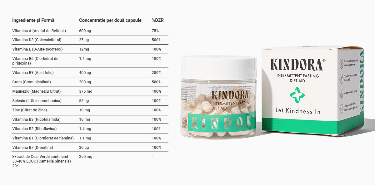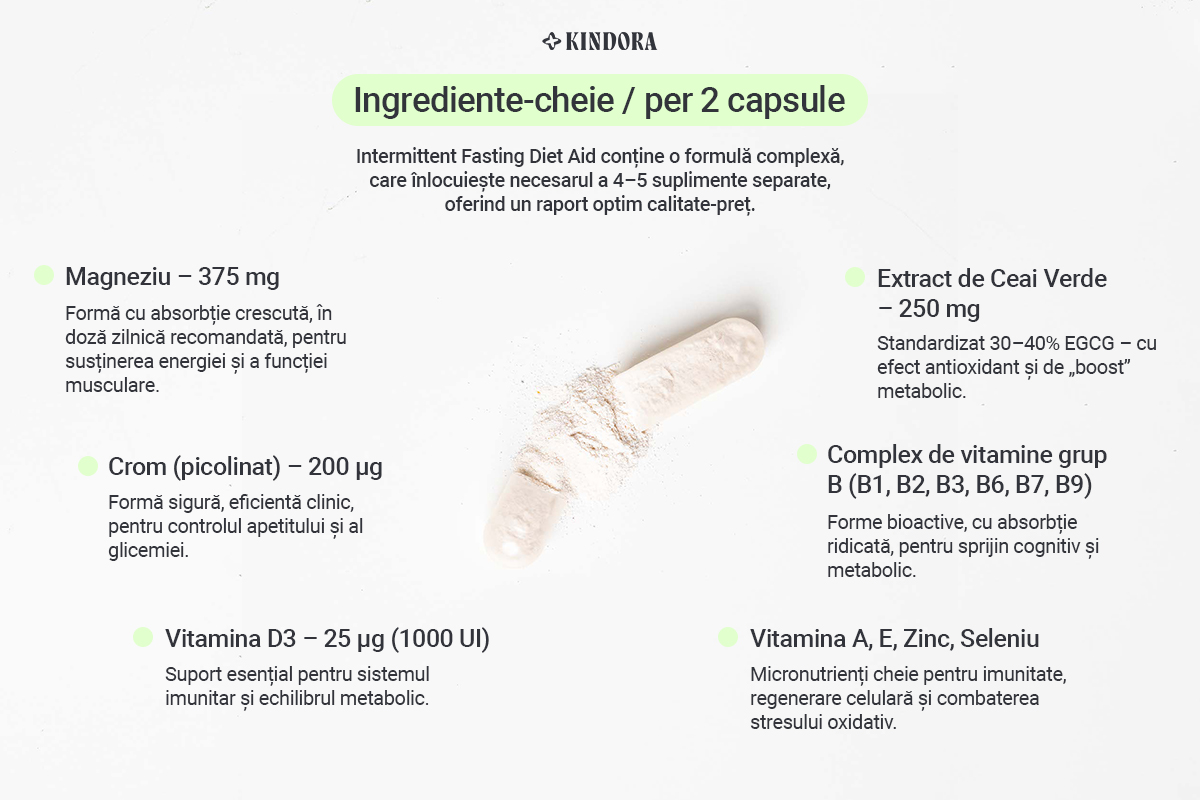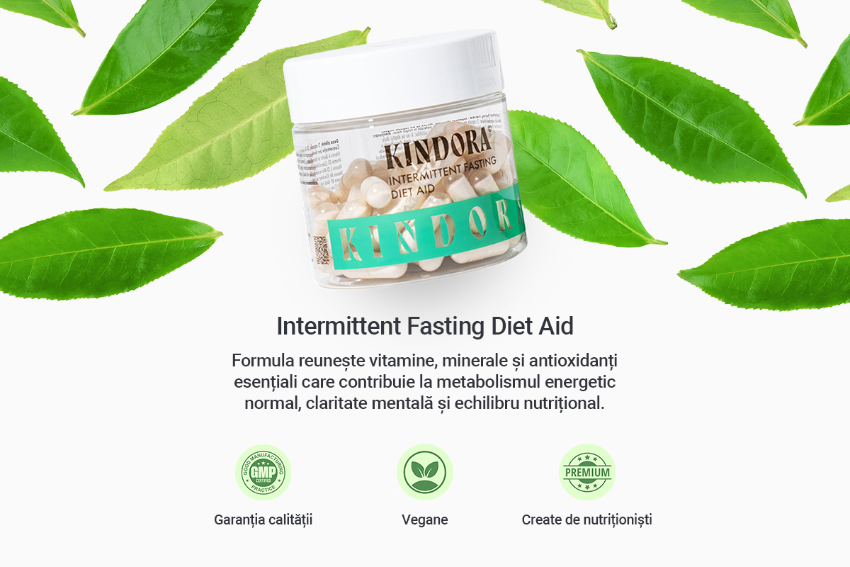 Intermittent Fasting Diet Aid este un supliment alimentar creat de nutriționiștii Kindora, destinat să susțină organismul în perioadele de post intermitent. Formula reunește vitamine, minerale și antioxidanți esențiali care contribuie la metabolismul energetic normal, claritate mentală și echilibru nutrițional în timpul ferestrelor de alimentație și repaus.