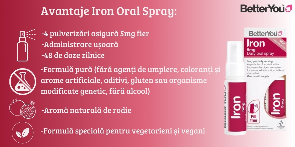 Cu o formulă avansată și o modalitate ușoară de administrare, BetterYou Iron Oral Spray este un supliment care te ajută să-ți menții nivelurile optime de fier în organism.