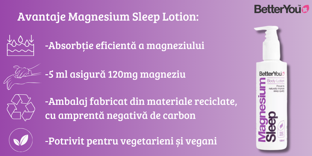 Loțiunea Sleep cu Magneziu de la BetterYou oferă o combinație specială de clorură de magneziu și uleiuri esențiale de lavandă și mușețel.