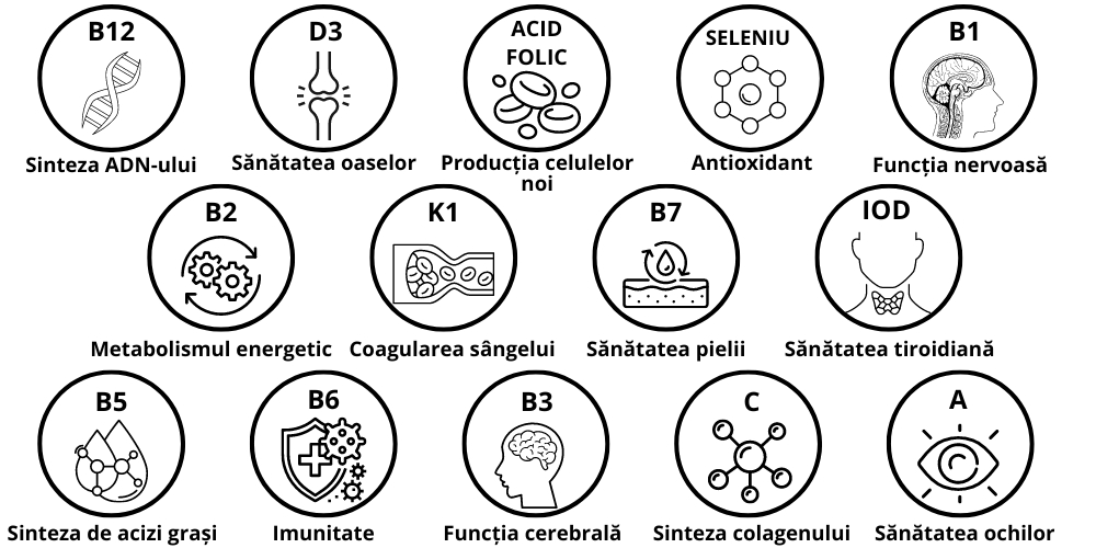 – Vitamina B12 (adenosilcobalamina și metilcobalamina) - 6µg 240% VNR*