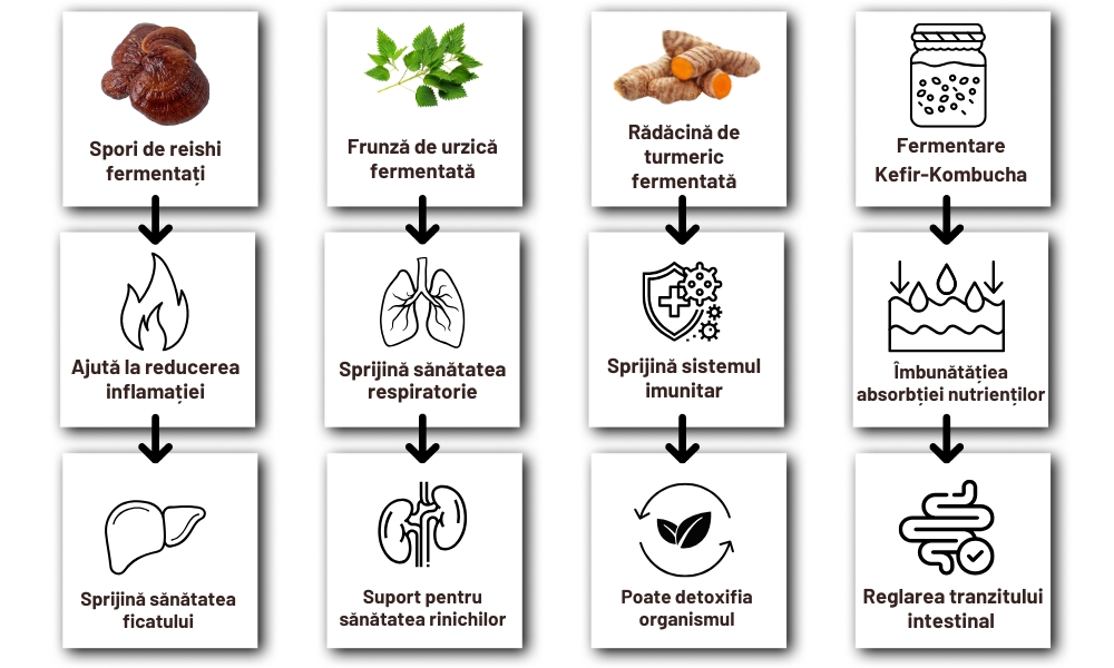 Ingrediente/2capsule: Spori de reishi fermentați (Ganoderma Iucidum) 300mg, frunză de urzică fermentată (Urtica dioica) 200mg, capsulă de celuloză vegetală (hidroxipropil metilceluloză), rădăcină de turmeric fermentată (Curcuma Ionga) 120mg.