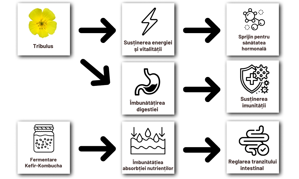 Fermentarea cu kefir-kombucha transformă ingredientele în forme biodisponibile, ceea ce înseamnă că substanțele nutritive sunt mai ușor absorbite și utilizate de organism.