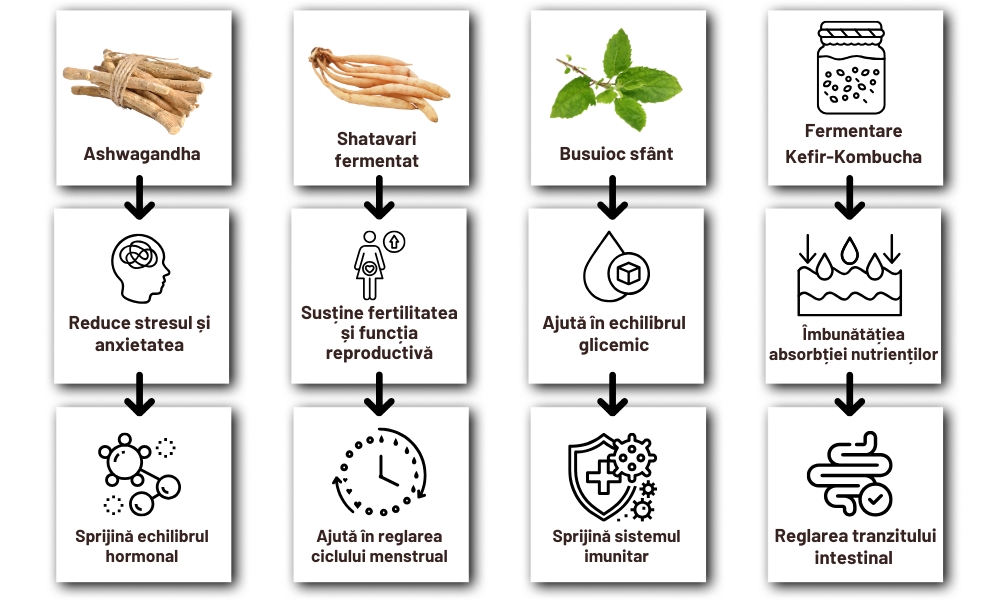 Shatavari: este o plantă adaptogenă folosită pentru a sprijini sănătatea hormonală și fertilitatea feminină. Poate ajuta la reglarea ciclurilor menstruale și poate reduce simptomele menopauzei. Shatvari poate ajuta la îmbunătățirea sănătății digestive, îmbunătățirea sistemului imunitar, fiind un tonic natural pentru combaterea oboselii și stresului.