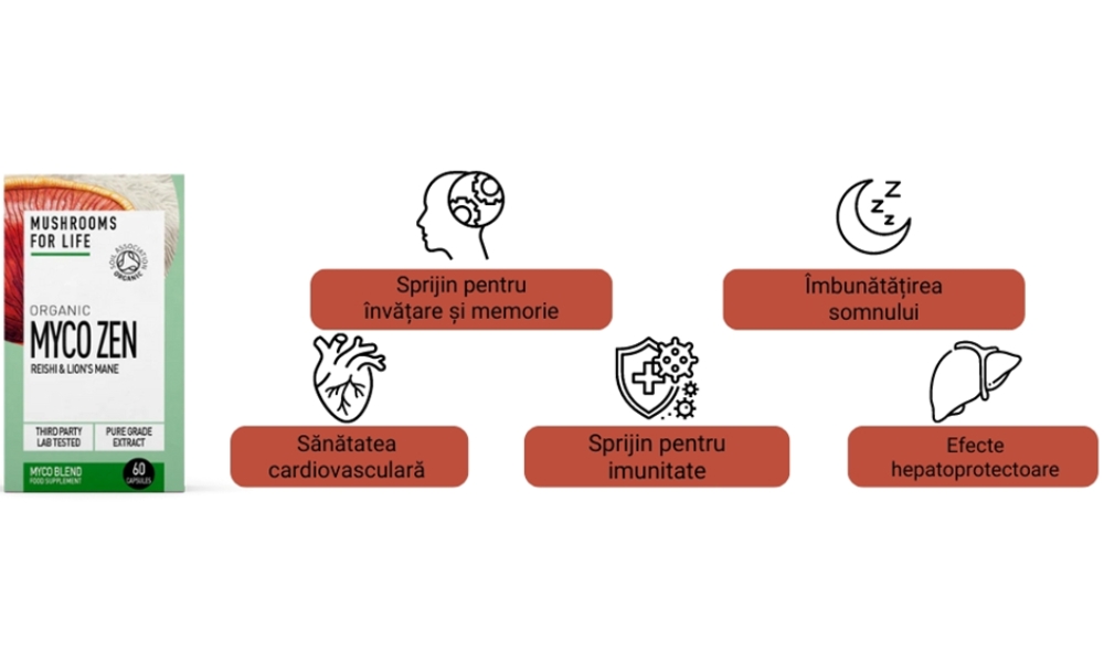Organic Myco Zen este un produs bogat de compuși, inclusiv beta-glucani, care poate oferi multiple beneficii pentru sănătatea creierului și a sistemului imunitar.