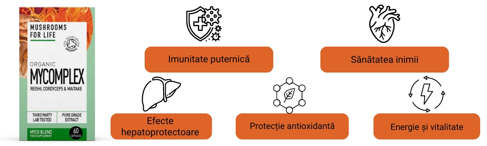 Mycomplex Organic este un echilibru bogat de compuși, inclusiv beta-glucani, care pot aduce multiple beneficii sănătății.