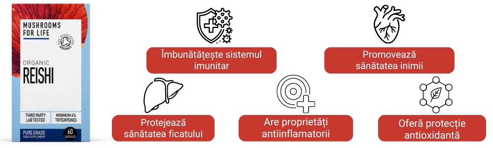 Ganoderma/Reishi contribuie la apărarea imunologică, contribuie la menținerea funcției circulatorii sănătoase, ajută la controlul colesterolului.
