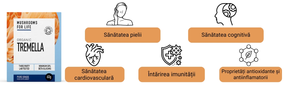 Tremella este o ciupercă utilizată de secole în medicina tradițională chineză. Aceasta oferă o gamă largă de beneficii, inclusiv susținerea sănătății cognitive, a pielii și acțiune antiinflamatoare și antioxidantă.