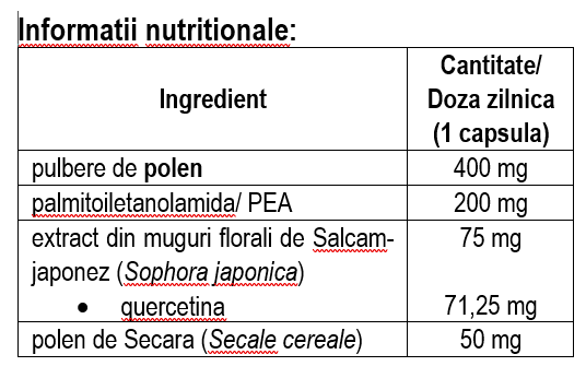 Ingrediente/capsula: pulbere de polen; palmitoiletanolamida / PEA; capsula vegetala (hidroxipropilmetilceluloza); extract din muguri florali de Salcam-japonez (Styphnolobium japonicum), continand 95 % quercetina; polen de Secara (Secale cereale); agent antiaglomeranti: dioxid de siliciu, saruri de magneziu ale acizilor grasi.