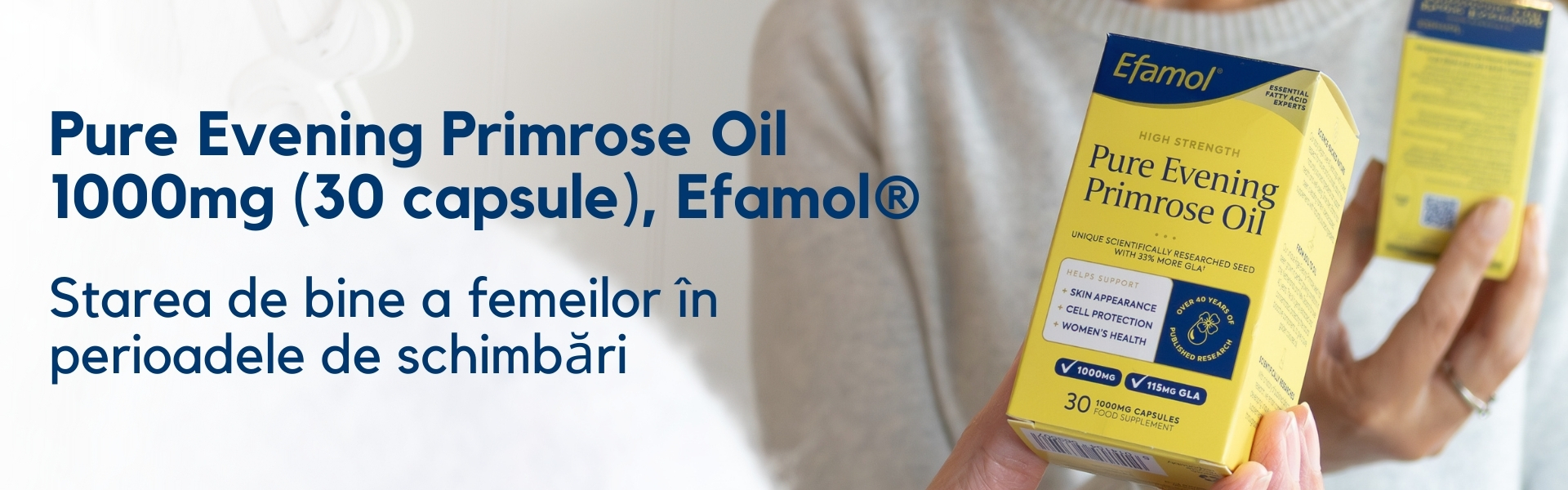 Pure Evening Primrose 1000 mg (30 capsule), Efamol® este un supliment alimentar creat științific, care susține starea de bine a femeilor în perioade de schimbări hormonale, sănătatea pielii și țesutului conjunctiv dar și echilibrul general al organismului, datorită conținutului său natural de GLA (acid gamma-linolenic) și vitamina E, cu rol antioxidant.