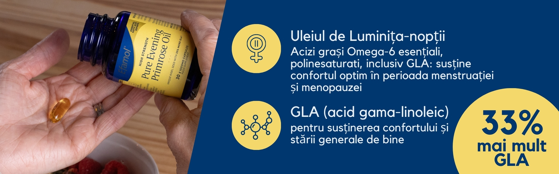 • GLA (acid gama-linoleic) este transformat în organism în DGLA, precursor de compuși implicați în menținerea confortului și stării generale de bine.