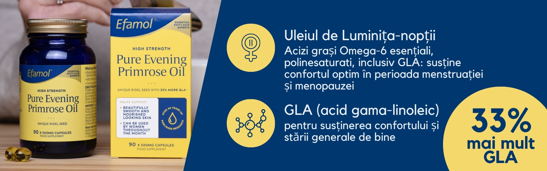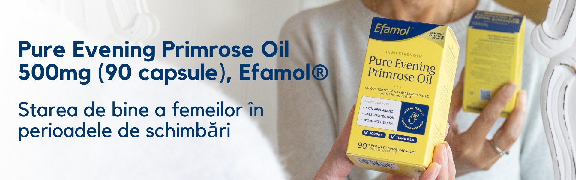 Pure Evening Primrose 500 mg (90 capsule), Efamol® este un supliment alimentar creat științific, care susține starea de bine a femeilor în perioade de schimbări hormonale, sănătatea pielii și țesutului conjunctiv dar și echilibrul general al organismului, datorită conținutului său natural de GLA (acid gamma-linolenic) și vitamina E, cu rol antioxidant.