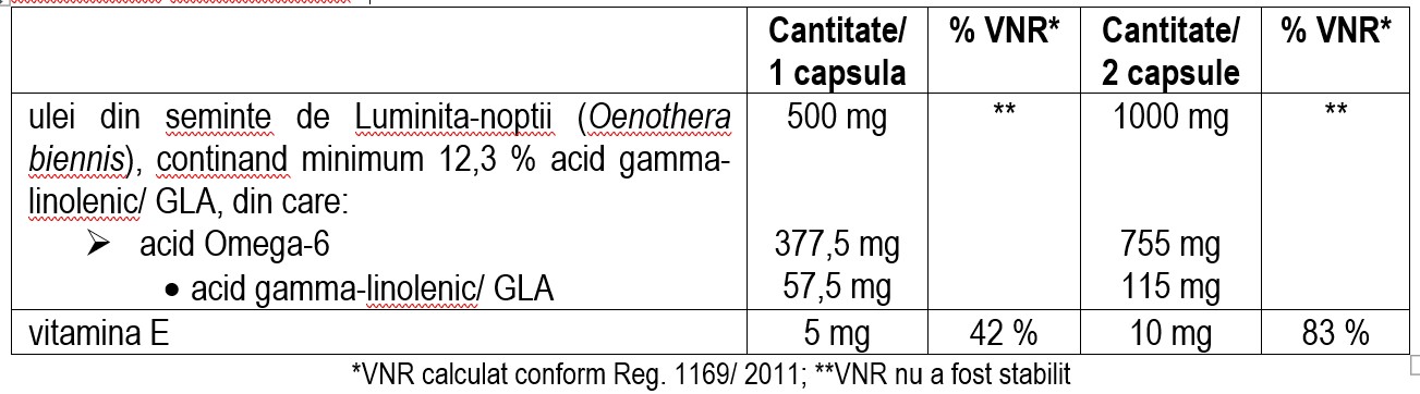 Ulei din semințe de luminița-nopții (Oenothera biennis), conținând minimum 12,3% acid gamma-linolenic / GLA; capsulă moale (învelișul capsulei: gelatină bovină; agenți de umezire: glicerină vegetală); D-alfa-tocoferol 1000 UI/g, furnizând vitamina E.