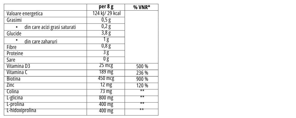 Produs vegan, inovator, cu gust delicios de zmeura, afine-siberiene, macese si sfecla-rosie, formulat astfel incat sa contina aminoacizi importanti: glicina, prolina, hidroxiprolina, vitamina C pentru formarea normala a colagenului, zinc pentru protejarea celulelor impotriva stresului oxidativ, biotina pentru mentinerea sanatatii pielii si a parului, vitamina D, fibre si proteine. Ingredientele au fost selectate pentru actiunea lor sinergica.