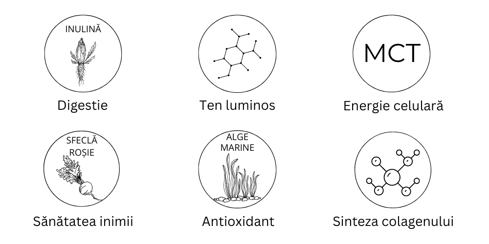 • Pudră de ulei MCT care este o sursă rapidă de energie și oferă sprijn pentru performanța mentală;