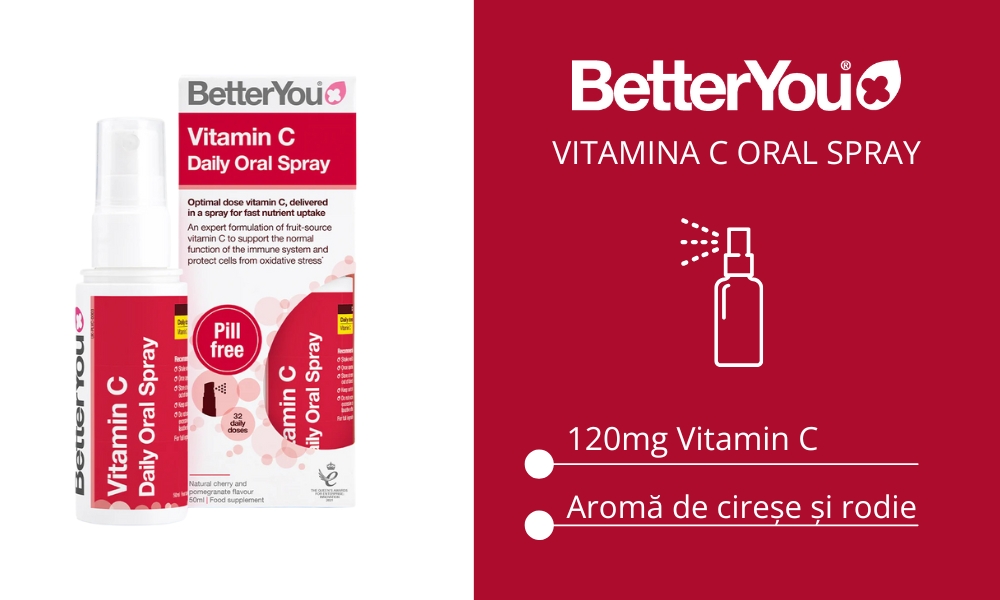 - Vitamin C Oral Spray de la BetterYou asigură o absorbție maximizată spre deosebire de comprimatele sau capsulele tradiționale, deoarece vitamina C este livrată direct prin mucoasa bucală, ocolind astfel sistemul digestiv, unde absorbția poate fi redusă sau întârziată.