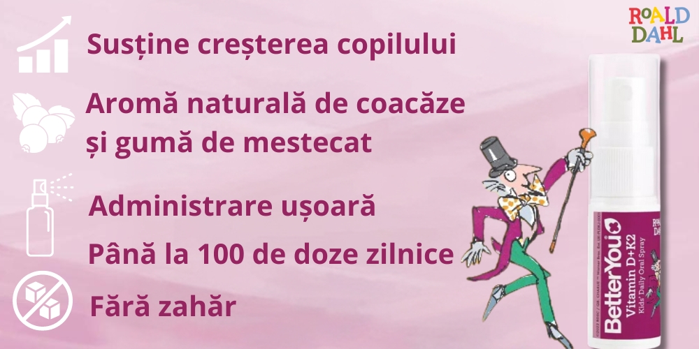 -Copii 1-8 ani: O pulverizare asigură: 400UI Vitamina D3 si 10μg Vitamina K2.