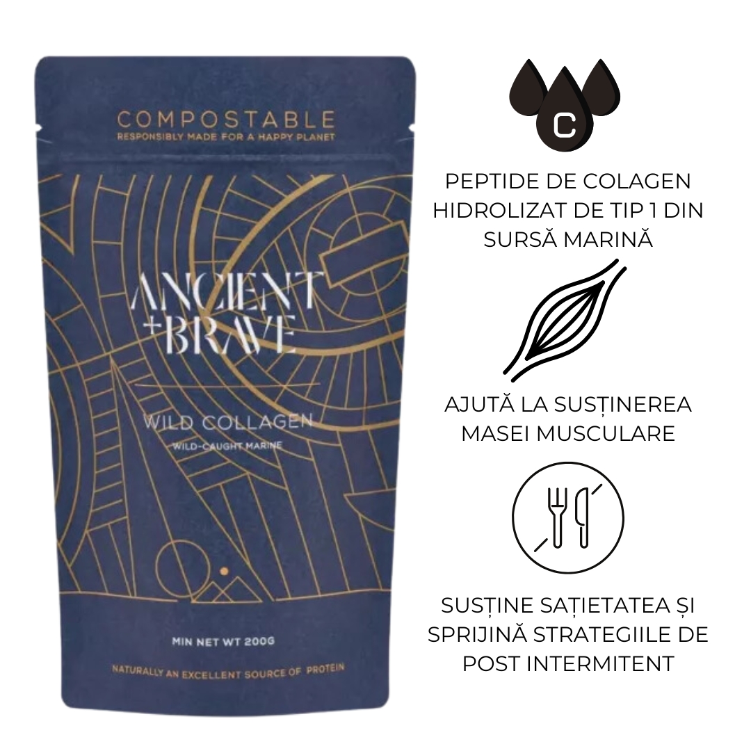 Faceți cunoștință cu Wild Collagen de la Ancient & Brave, colagen de tip I marin pentru frumusețe și sănătate. Fără conservanți, fără coloranți sau arome artificiale, fără zahăr sau îndulcitori, DOAR ce e mai bun și mai pur din natură.